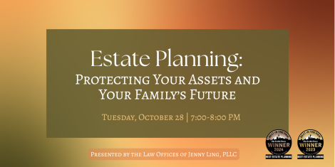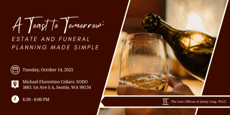 Join Estate Planning Attorney Jenny Ling of the Law Offices of Jenny Ling, PLLC, and Carlos Zamora, Advance Planning Specialist, for an evening of wine and wisdom!